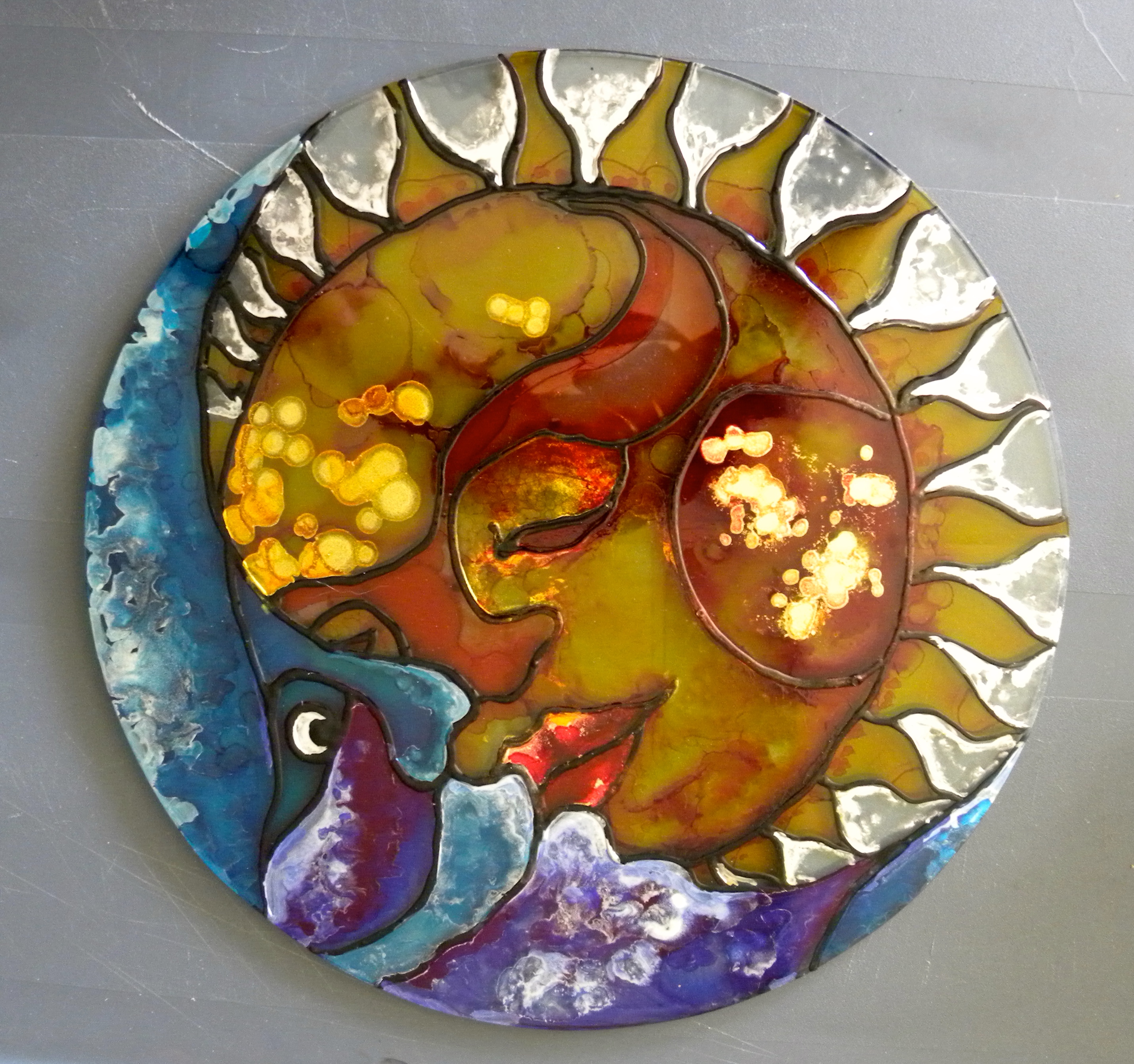 This was a commissioned piece of art we designed to look like stained glass that began as a round blank piece of glass and was to be a sun and moon.