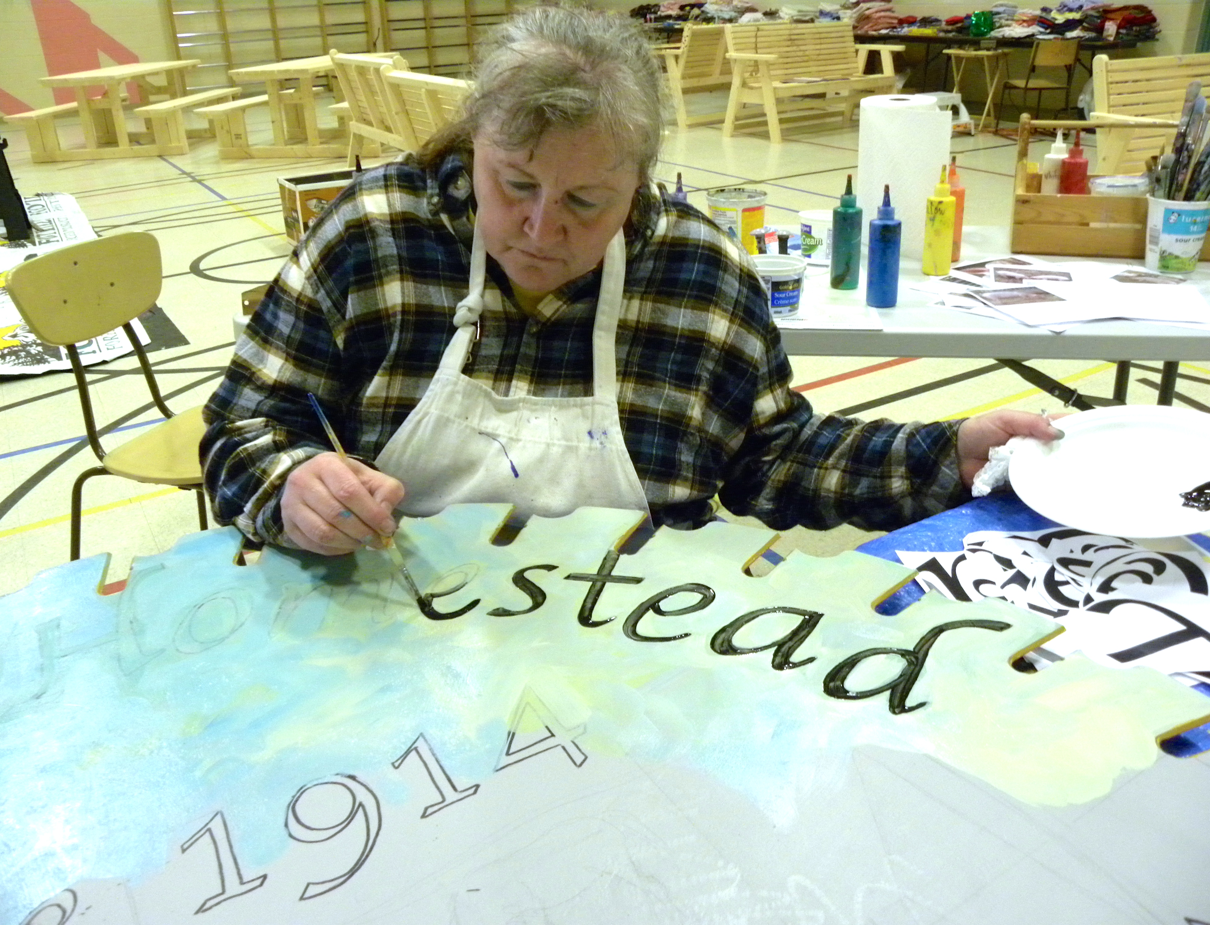 Four Door Arts Forum was commissioned to design a sign on a used 4.5′ saw blade with an artistic image of “the old homestead”. The original homestead has been turned into a 100 year heritage site. Below is the progress that followed.