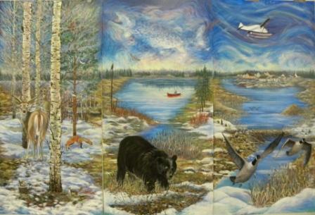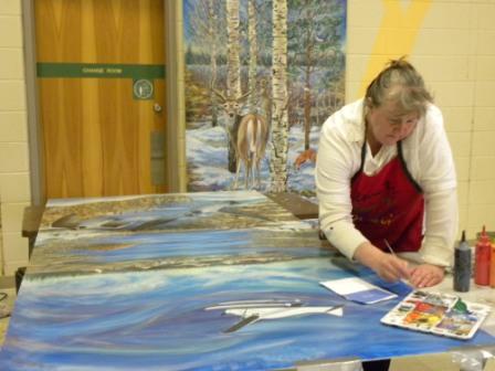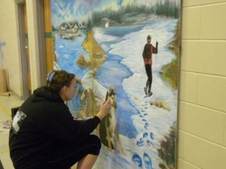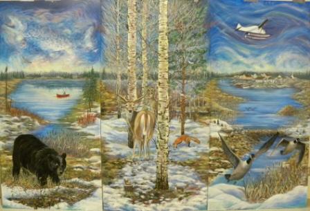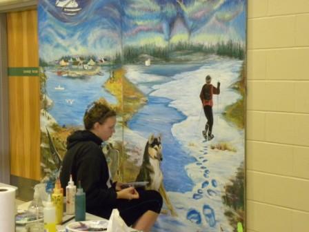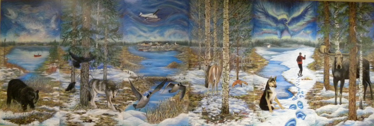 The Four Door Arts Forum painted an interchangeable six panel mural for Gateway Mall in Prince Albert, SK. Representing the North in its natural beauty, the painting flows together in completeness by utilizing all six of the 8ft x 4ft panels.